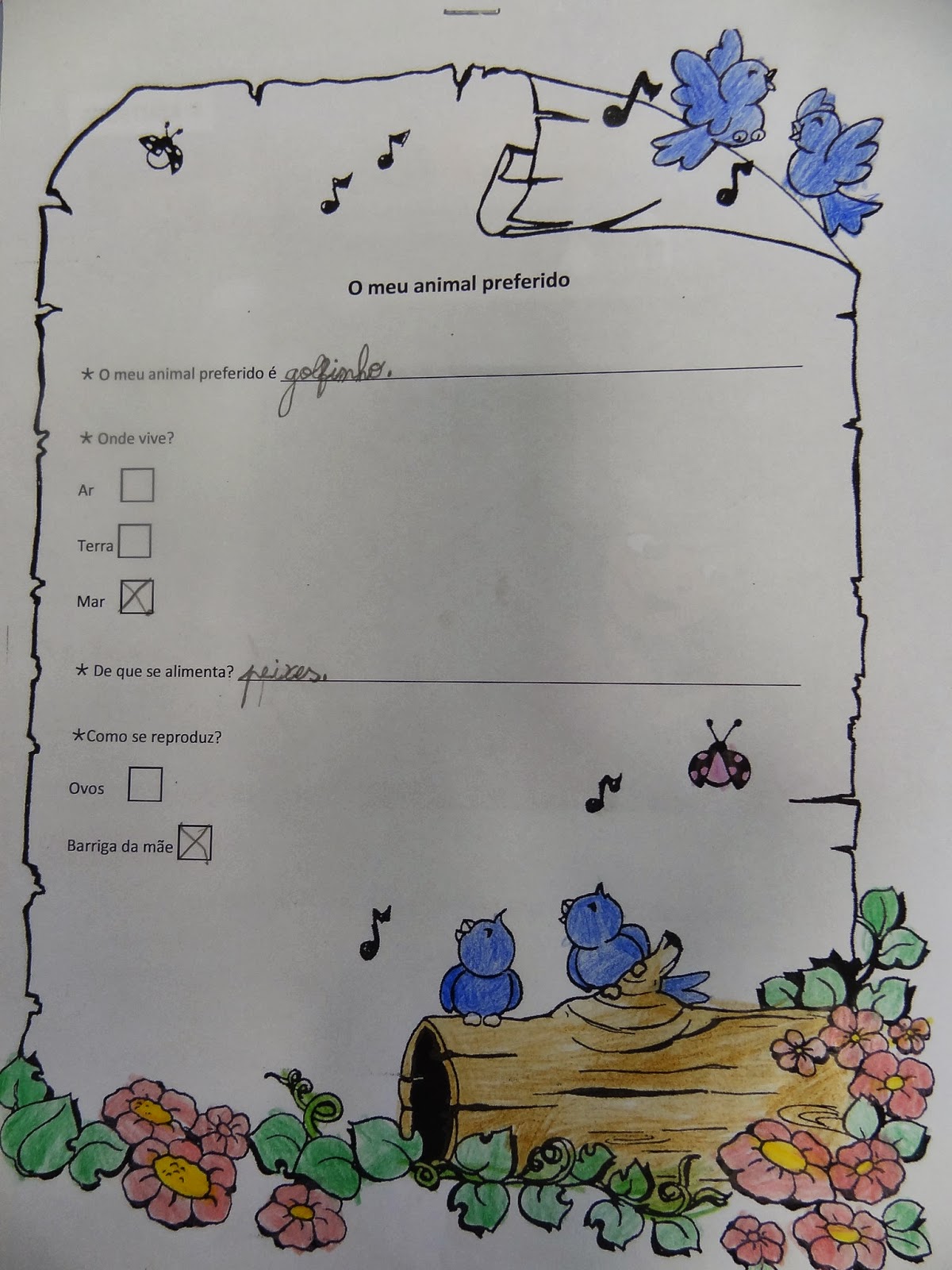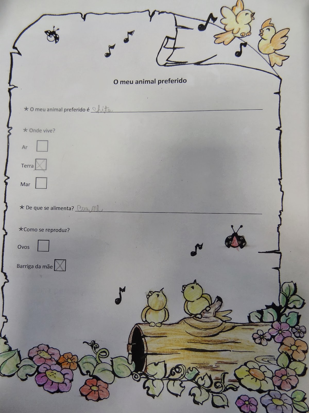 Entre eles fizemos um, no qual tinhamos que escolher o seu animal preferido e escrever sobre ele, fazendo uso dos conhecimentos adquiridos em Estudo do Meio.