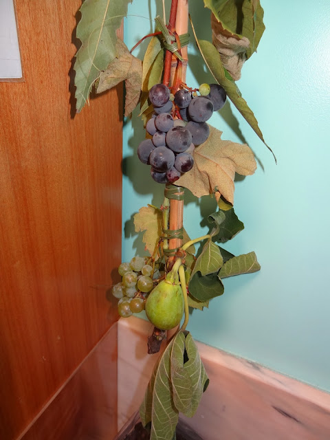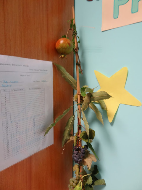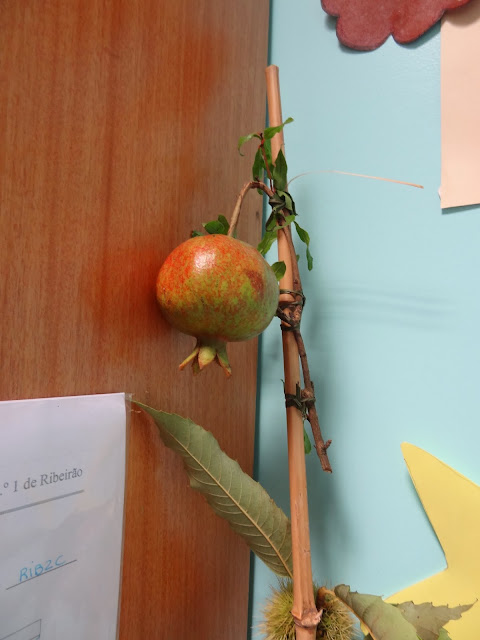 O Pedro trouxe uma vara de frutos, ou seja, juntamente com o pai, o Pedro foi colocando alguns frutos de outono que tem plantados no seu quintal.
